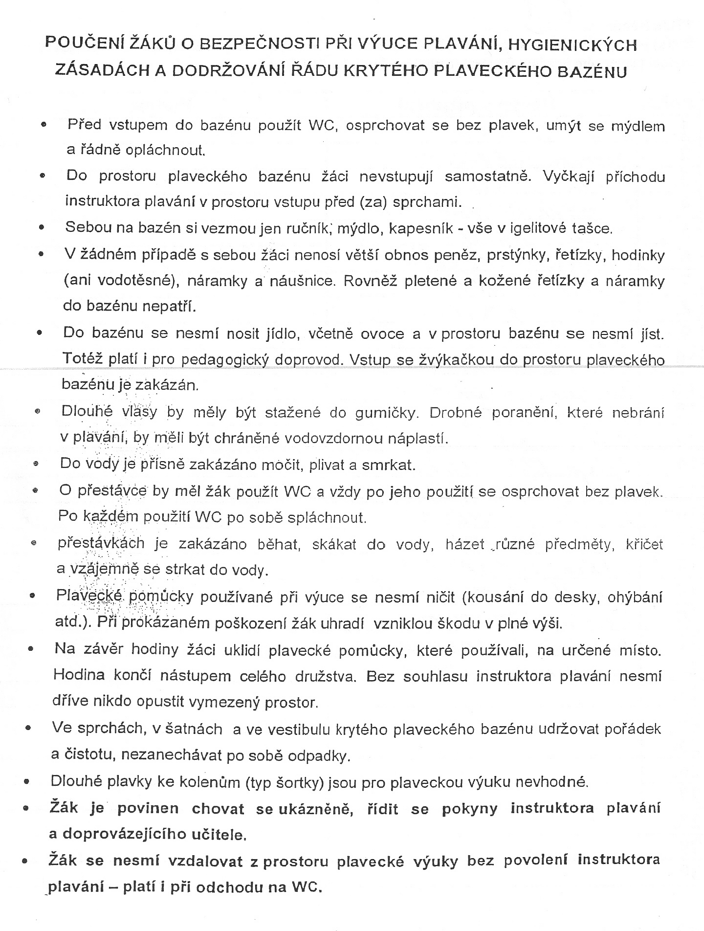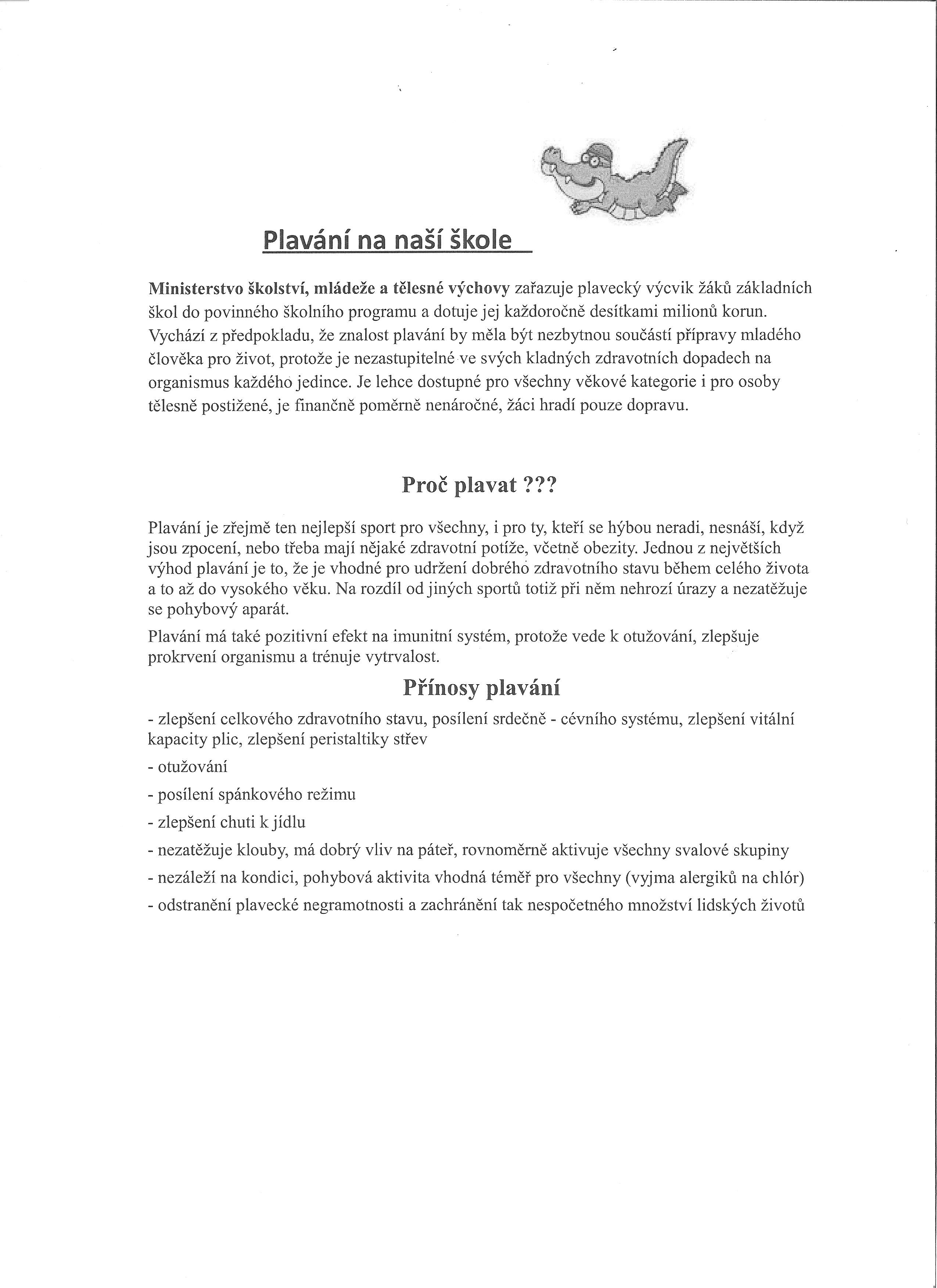Krytý bazén Ústí nad Orlicí Harmonogram plavání pro 2., 3. a 4. ročník Proč plavat? Poučení o bezpečnosti, hygieně a dodržování řádu na bazénu