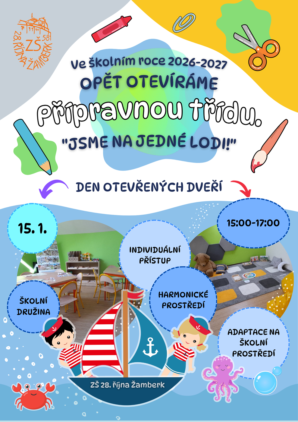 První školní den Seznam pomůcek pro děti přípravné třídy Seznam žáků 2025/2026 Přípravná třída 2026-2027 Denní režim Žádost (.pdf) Žádost (.docx) Školní vzdělávací program (2025) Plavba za poznáním – plakát