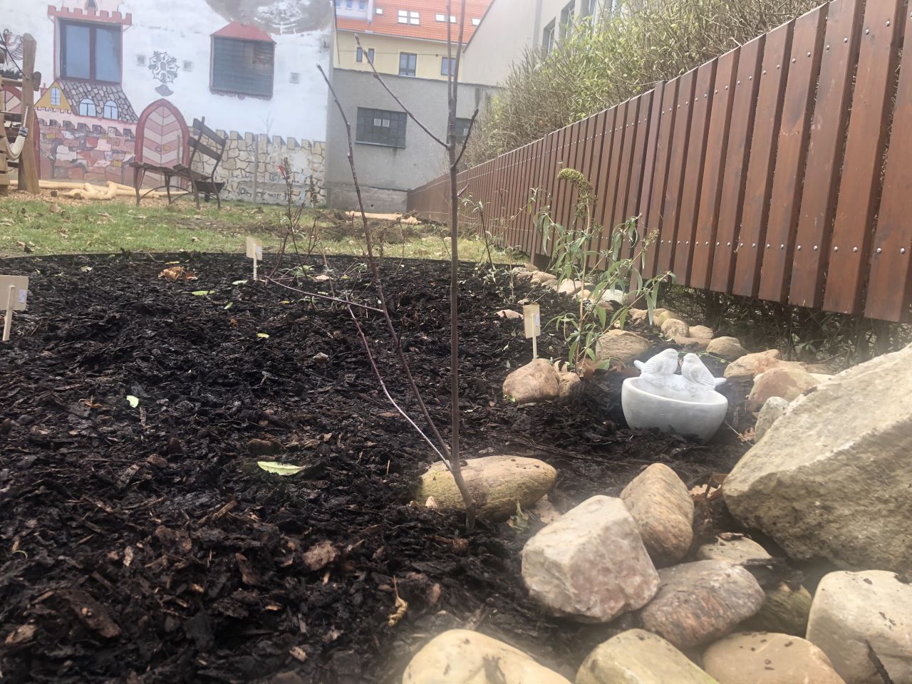Jsme velice rádi, že díky projektu „ Vracíme zahradě život“ se mohly na naší zahradě vysadit nové kvetoucí rostliny a dřeviny. Našli jsme také prostor pro založení luční zahrady. Rozmístili jsme několik hmyzích domečků, krmítko, vytvořili jsme u něj jednoduché pítko pro drobné ptactvo, mlžítko pro zvlhčení půdy a okolních rostlin. Také jsme zpřístupnili dětem na zahradě pitnou vodu. Díky větší rozmanitosti a různorodosti rostlin se snad navrátí do naší zahrady více drobných živočichů, kteří z ní úplně vymizeli. Do městské zástavby patří a obohacují ji.