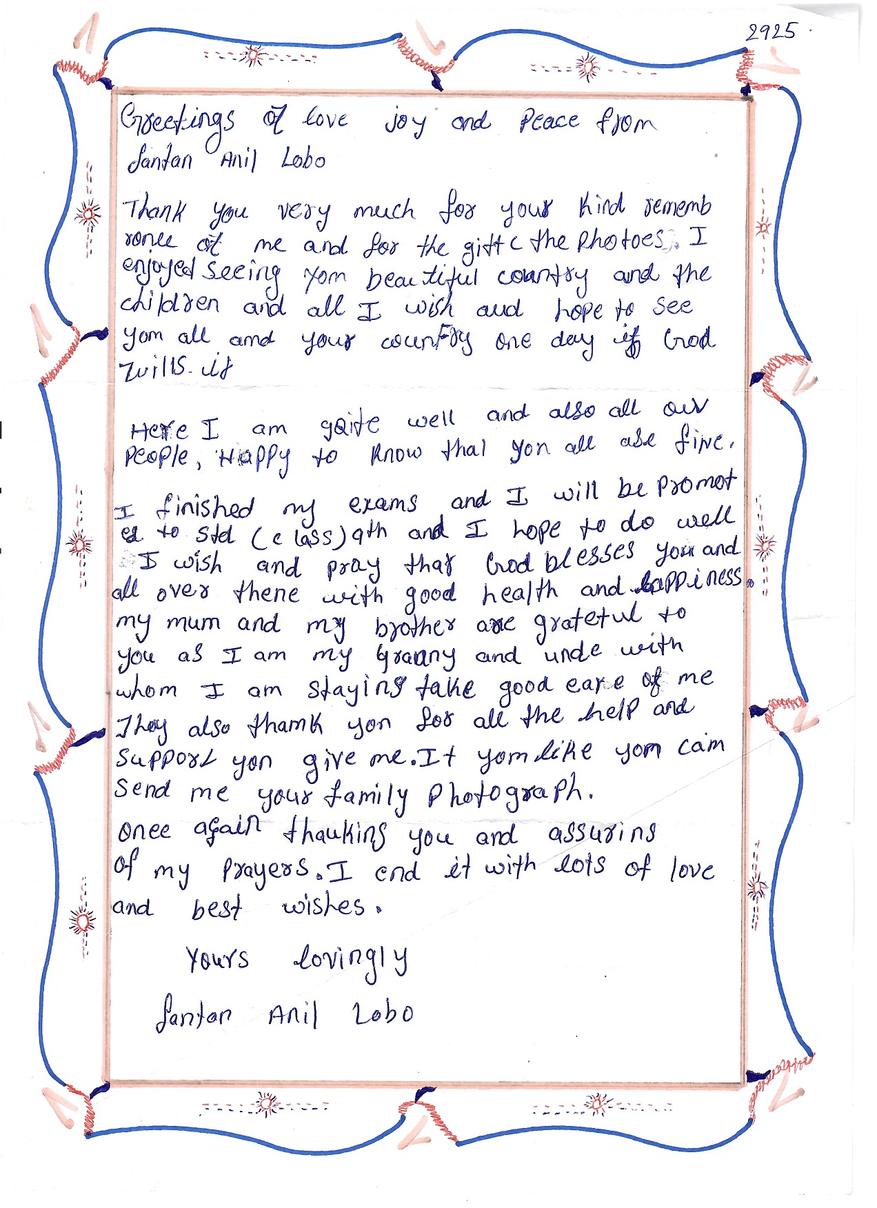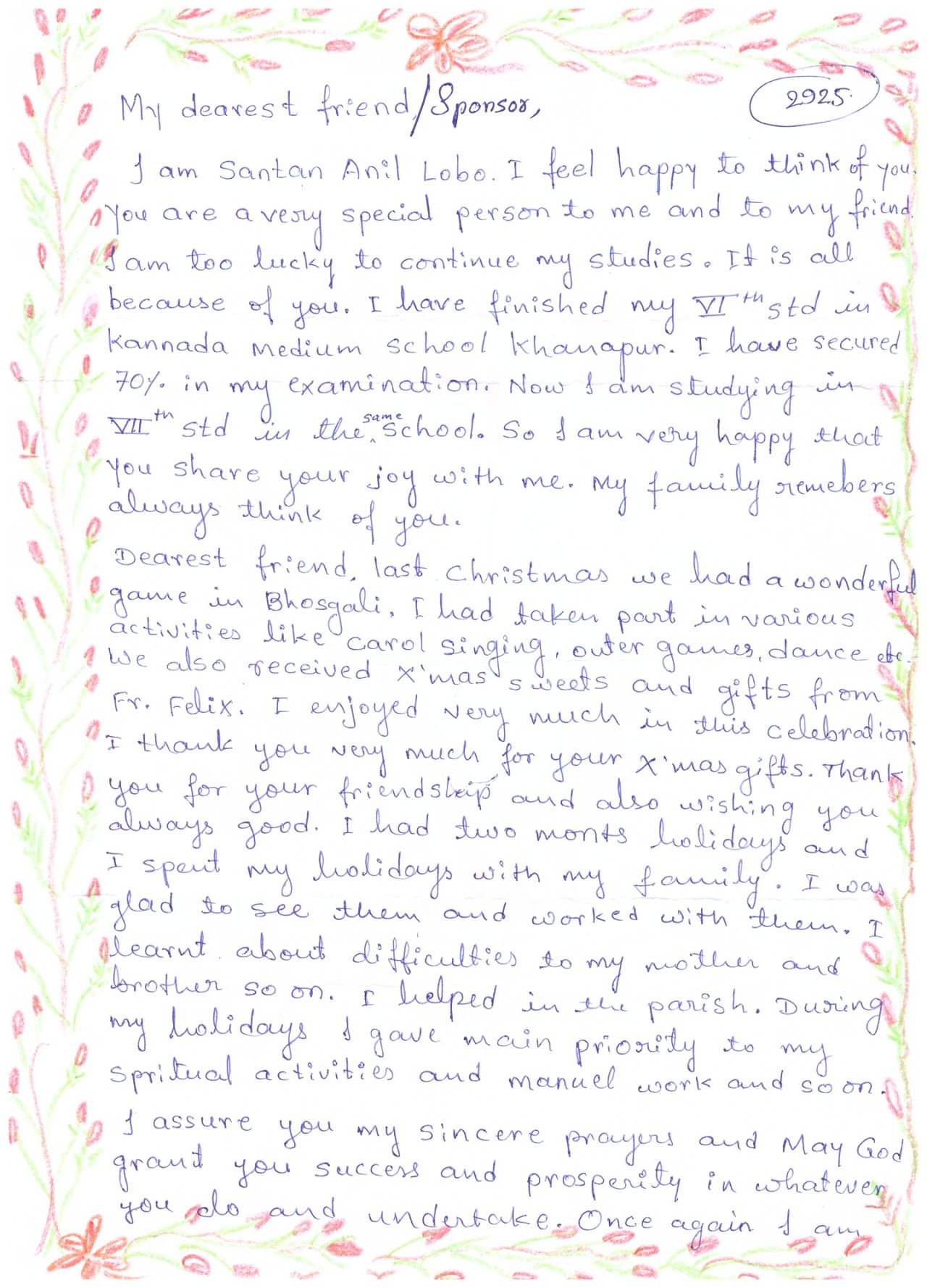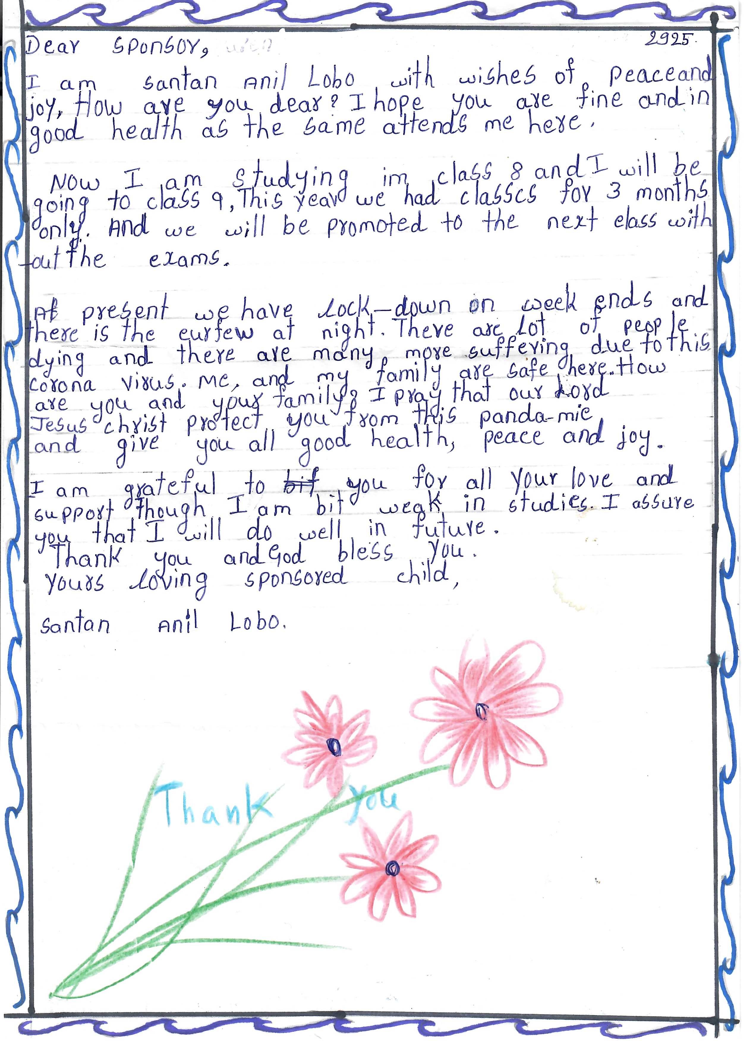 Věděli jste, že naše škola „adoptovala“ indického chlapce? Jmenuje se Santan Anil Lobo, narodil se v roce 2006 a naše škola ho v roce 2014 adoptovala v rámci projektu Adopce na dálku, který organizuje Diecézní katolická charita Hradec Králové (adopce.hk.caritas.cz).